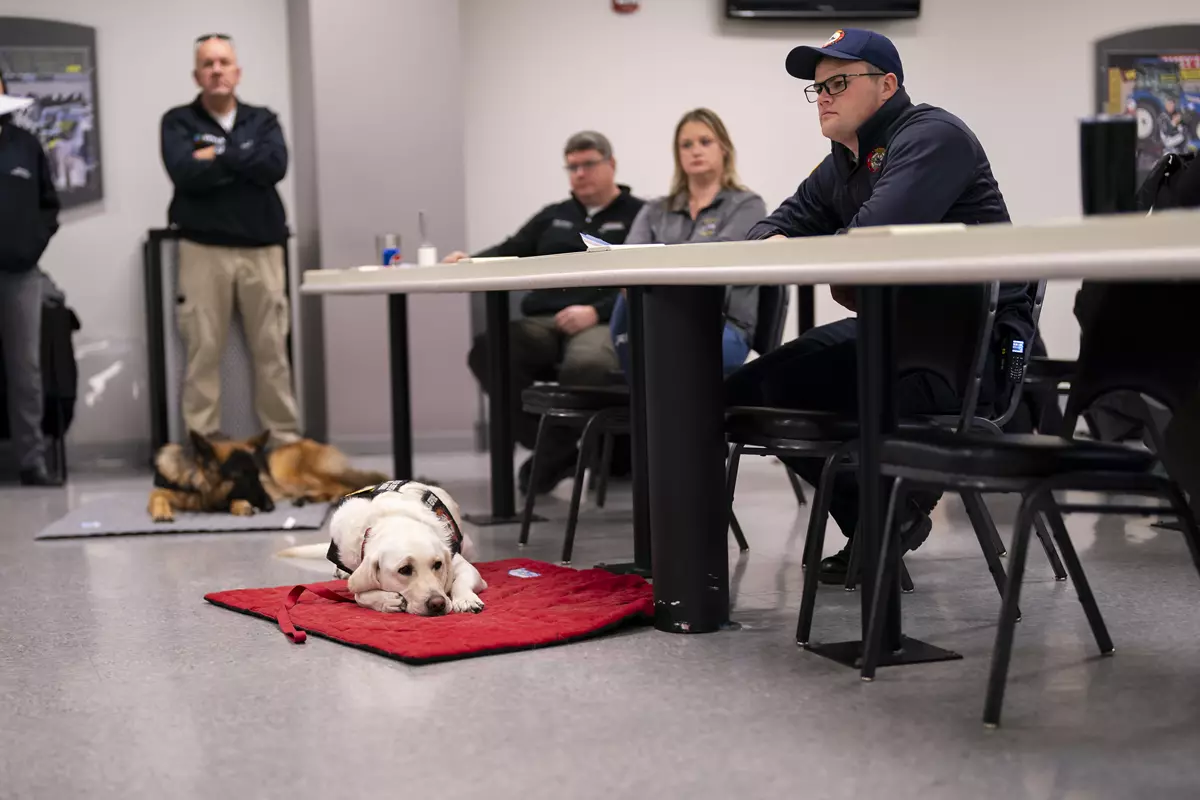 Master K9 trainers Sgt. Darrah Metz and Ret. Ofc. Mike Paulins of TEAMK9 Academy Academy have developed a nationwide program recognized as the gold standard to certify First Responder K9 teams in Crisis Response. Through their training program, Metz and Paulins provide instruction and certification for Crisis Canines of the Midlands’ teams. Academy training provides a specialized training experience for the first responder world – preparing teams to be ready to respond with little to no notice, providing a calm, comforting presence in the face of intense emotion, grief, and even chaos.